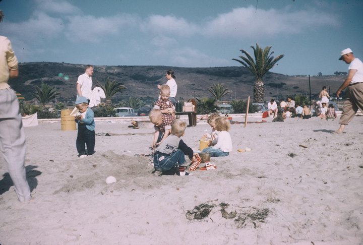 Submarines tied to submarine tenders were a common sight in San Diego Bay in the 1950s. This view looks west down Cedar Street from St. Joseph's Cathedral to the Civic Center.