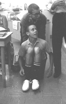 | Oh, man, Gary Bonwell looks about 12 in the first two photos above, so I'm wondering if they were taken at Horace Mann. I don't know what's happening, but it looks like Gary lost a bet. I'm guessing that's Rob Wied stuffing him into a trash can. Could that be Mr. Rumsey in the second photo? Billie Jean Cameron is exiting Room 513 in the third shot. It could be Linda Hebert already out the door. Someone out there will know who taught in 513. |