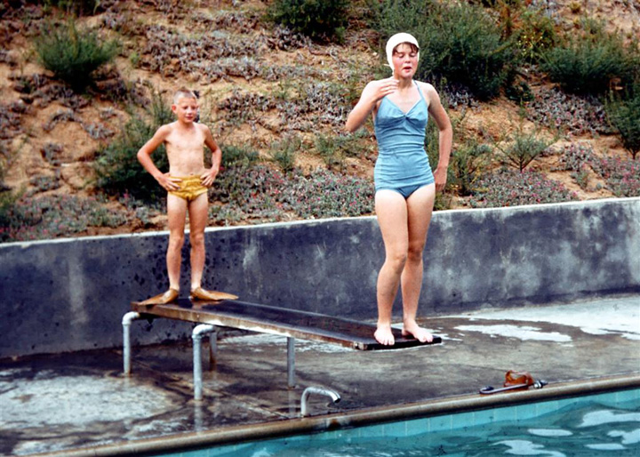 | I found a slide from Spring,1955 in my dad's collection that might amuse the Crawford crowd. It was taken at a SDSU faculty picnic somewhere in the east county, with a large pool (Green Valley Falls maybe?) and features Barbara Hobart '59 on the diving board with Spencer Milne '60 waiting his turn, flippers in hand. Barbara was a good friend of my sister Margaret ('59) in junior high and came with us. Amazing how different an 8th grade girl and a 7th grade boy look! The snorkle and mask are Spencer's too. The Milnes lived right behind us on Linda Paseo. Their dad taught Sociology at State. Barbara lived on East Falls View Dr -- Bob Richardson '61 |